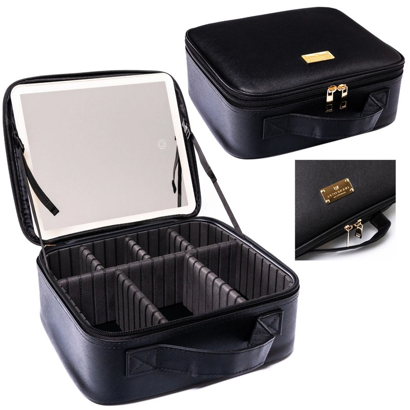 - Szkatułka na biżuterię ze skóry ekologicznej w czarnym kolorze. Jej modułowe przegródki z piankową wyściółką pozwalają dopasować wnętrze do swoich potrzeb. Pomieszczą podkłady, cienie, pomadki i pędzle. Wyposażona w lusterko z podświetleniem LED.