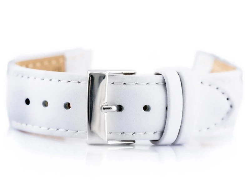 Pasek ze skóry naturalnej w kolorze białym z białymi przeszyciami. Klamerka ze stali szlachetnej w kolorze srebrnym.