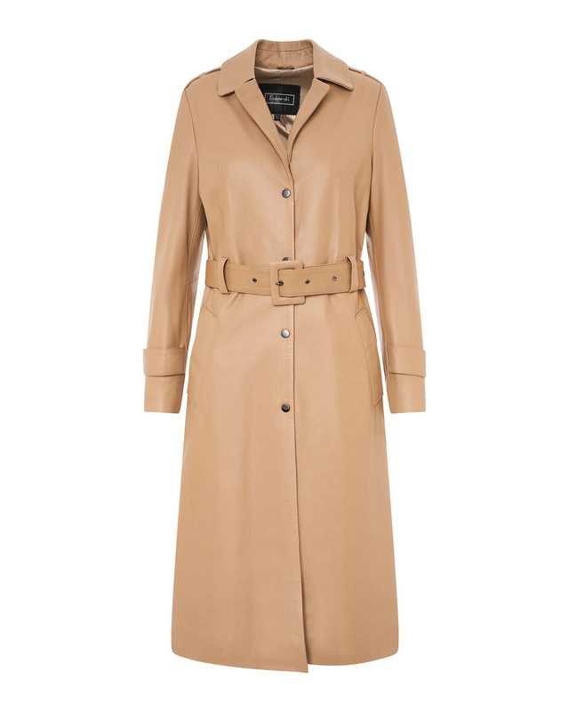 Trencz wykonano w całości z naturalnej skóry najwyższej jakości, która gwarantuje trwałość, komfort oraz wyjątkowy wygląd przez długie lata. Miękka, przyjemna w dotyku skóra pięknie układa się na sylwetce, dodając płaszczowi klasy i lekkości.