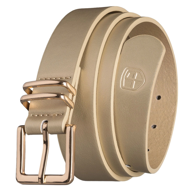 Beżowy, wąski pasek damski ze skóry ekologicznej ze złotą klamrą - Peterson