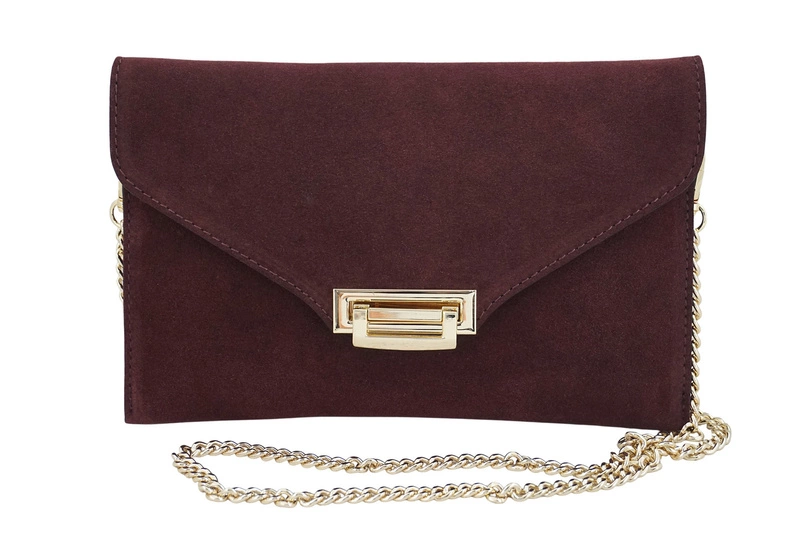 Stylowa kopertówka zamszowa Barberinis w kolorze bordowym - podkreśl swój styl torebką stworzoną z myślą o kobietach ceniących ponadczasową elegancję i najwyższą jakość wykonania. Modna i kobieca stylowa kopertówka zamszowa Barberinis zachwyca prostotą, a jednocześnie przyciąga uwagę ozdobnym zapięciem i subtelnym złotym łańcuszkiem, który nadaje całości luksusowego charakteru. Klasyczny fason sprawia, że pasuje do każdej stylizacji - zarówno na wieczorne wyjście, romantyczną kolację, jak i uroczyste przyjęcie.