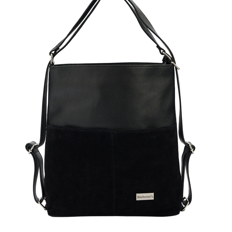 Torebka plecak z zamszem w kolorze czarnym - duża skórzana torebka 2w1 z zamszowymi kieszeniami marki Barberini’s. Elegancka i funkcjonalna torebka plecak z zamszem to idealny wybór dla kobiet ceniących styl i wygodę. Wykonana z wysokiej jakości skóry licowej w połączeniu z miękkim zamszem, zachwyca nie tylko wyglądem, ale i praktycznym wykończeniem. Torebka posiada funkcję 2w1 – dzięki regulowanym paskom można ją nosić na ramieniu lub jako plecak, dopasowując sposób noszenia do własnych potrzeb i okazji.