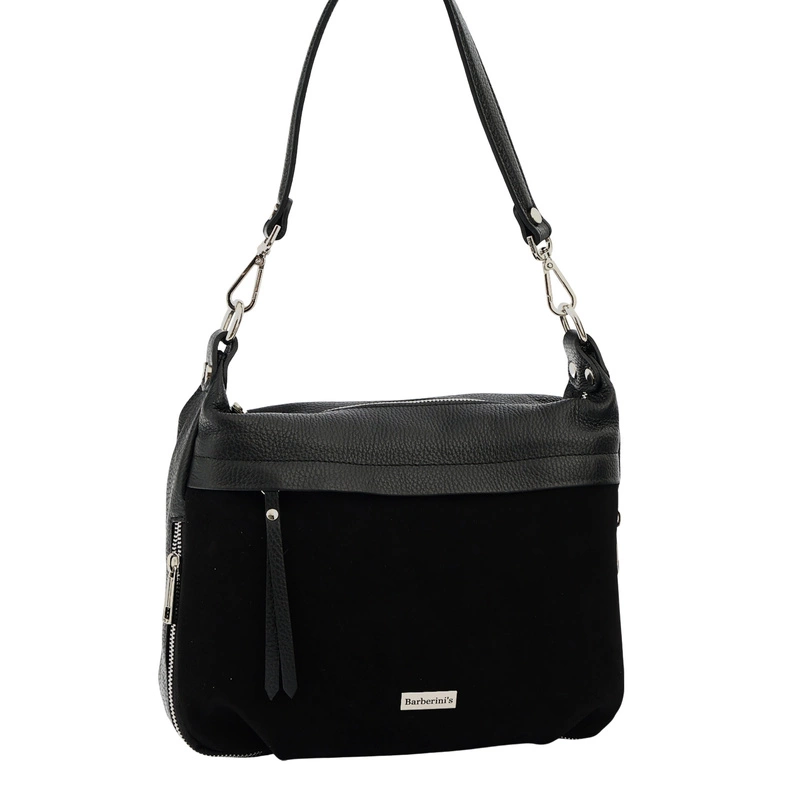 Skórzana torebka z zamszowym akcentem w kolorze czarnym - elegancja i funkcjonalność w jednym. Odkryj idealne połączenie stylu, wygody i praktyczności. Skórzana torebka z zamszowym akcentem to model stworzony dla kobiet ceniących klasykę w nowoczesnym wydaniu. Wykonana z wysokiej jakości skóry naturalnej, z przodem wykończonym miękkim, przyjemnym w dotyku zamszem, prezentuje się elegancko i ponadczasowo. To idealna propozycja zarówno do pracy, na spotkanie, jak i na co dzień – praktyczna, a zarazem pełna elegancji. Elegancka, ale jednocześnie praktyczna skórzana torebka z zamszowym akcentem doskonale sprawdzi się w każdej sytuacji – do pracy, na zakupy, spotkanie z przyjaciółmi czy weekendowy wyjazd. Pięknie komponuje się zarówno z klasycznymi stylizacjami biurowymi, jak i z luźnymi zestawami w stylu casual.