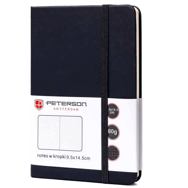- Kompaktowy notes w formacie A6 w czarnym kolorze zadrukowany w kropki. Świetnie sprawdzi się w codziennym użytkowaniu. Prosty, elegancki wygląd sprawia, że pasuje zarówno do pracy, jak i na uczelnię czy spotkania. Wyposażony w gumkę zamykającą.