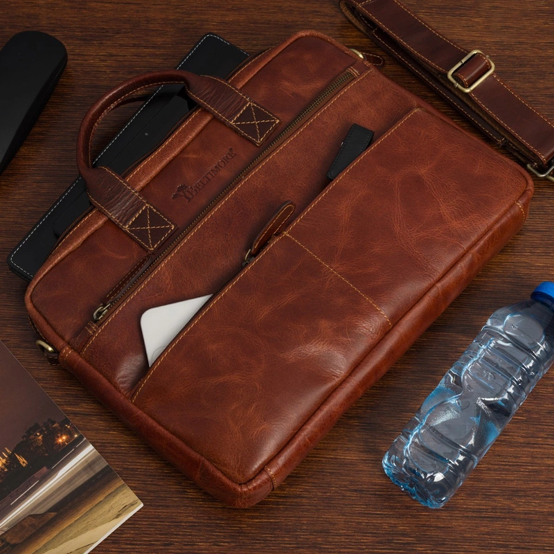 Ta torba na laptopa, uszyta z trwałej, specjalnie postarzanej skóry naturalnej, to idealne połączenie bezpieczeństwa i unikalnego charakteru.