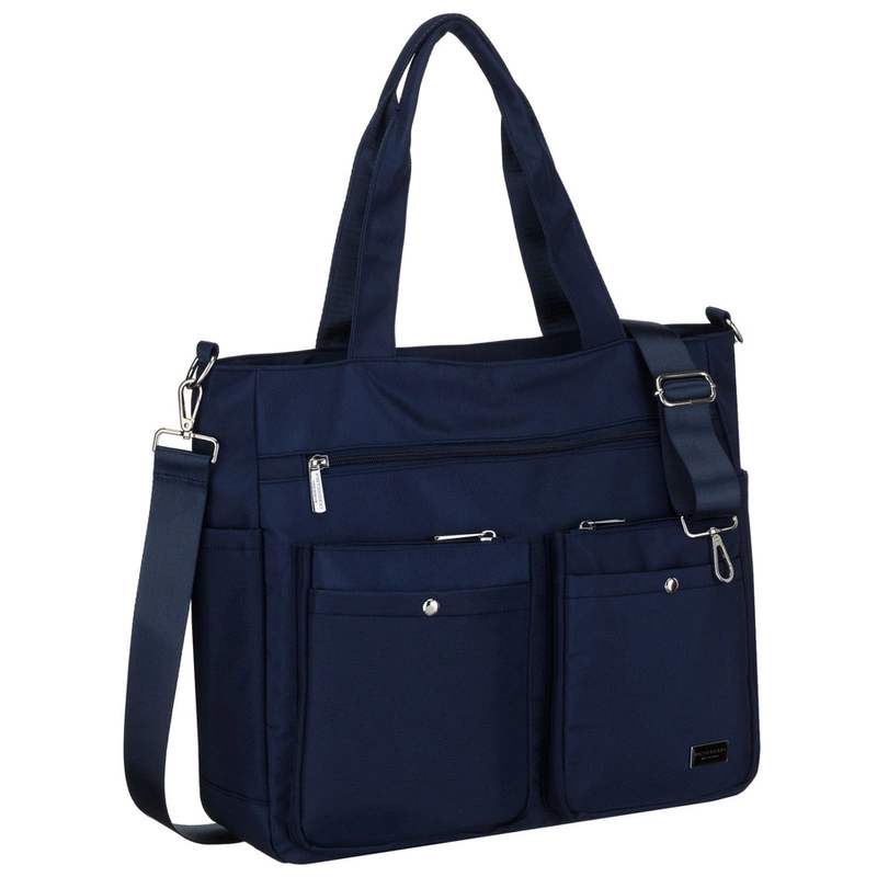 - Torba damska wykonana z poliestru w granatowym kolorze. Wyposażona w przegrodę na laptopa, wygodne uchwyty i doczepiany, regulowany pasek. Jednokomorowa z aż jedenastoma dodatkowymi kieszonkami. Zamykana suwakiem.
