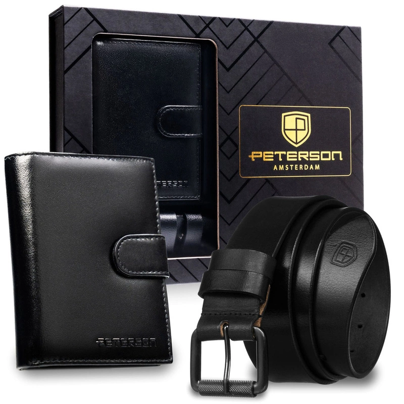 Zestaw prezentowy: skórzany, pionowy portfel męski w czarnym kolorze z systemem RFID i pasek ze skóry naturalnej - Peterson