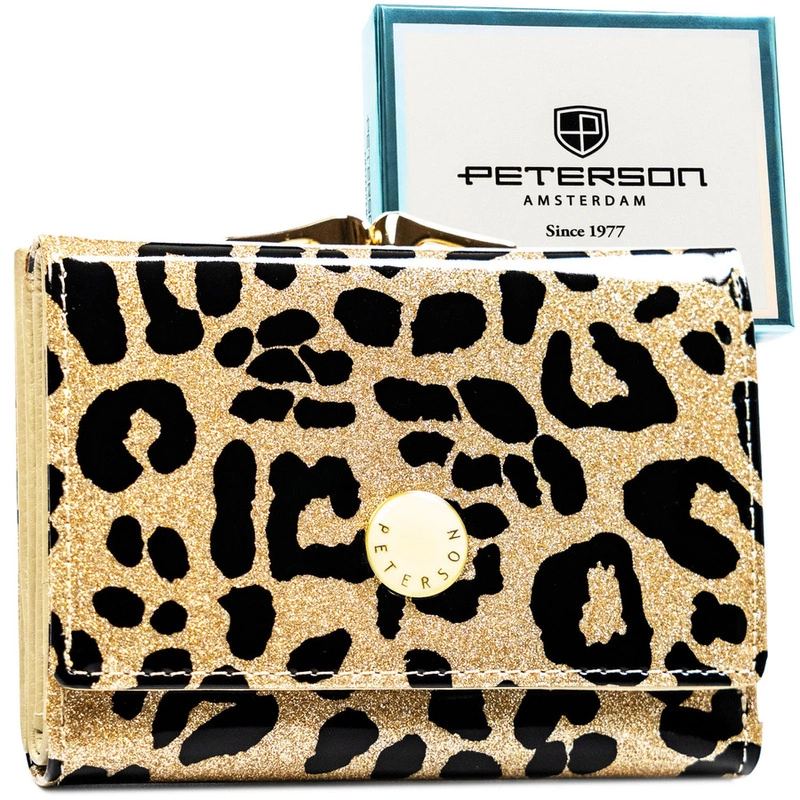 Złoty portfel damski ze skóry ekologicznej i naturalnej w cętki, zamykany biglem i zatrzaskiem - Peterson