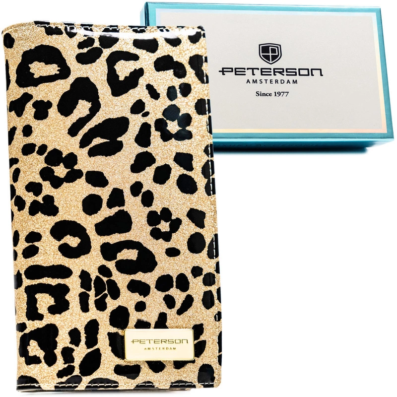 Duży, złoty, pionowy portfel damski ze skóry ekologicznej i naturalnej w cętki zamykany magnesem - Peterson