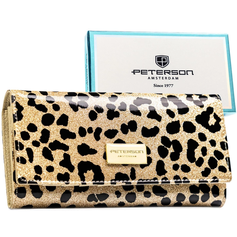 Duży portfel damski ze skóry ekologicznej i naturalnej w złotym kolorze zamykany zatrzaskiem - Peterson