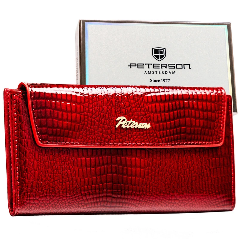 Duży, poziomy portfel damski ze skóry ekologicznej w czerwonym kolorze z tłoczeniem na wzór skóry krokodyla - Peterson