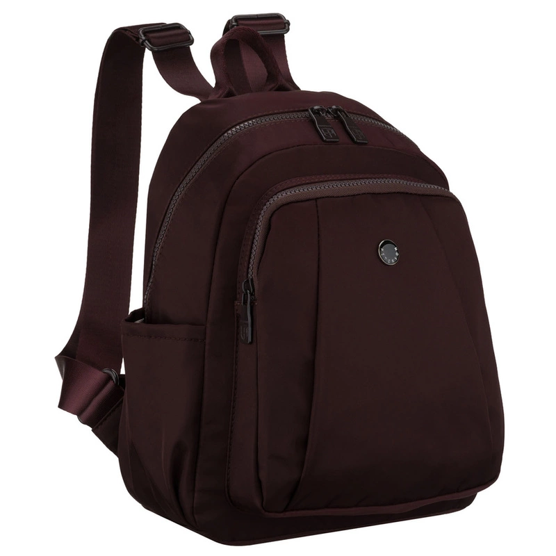 - Mały plecak damski wykonany z poliestru w bordowym kolorze. Jednokomorowy z 7 dodatkowymi kieszonkami. Zamykany suwakiem i zawieszony na regulowanych szelkach.