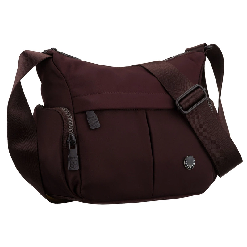 Bordowa listonoszka damska z poliestru zawieszona na szerokim pasku, dwukomorowa - Peterson