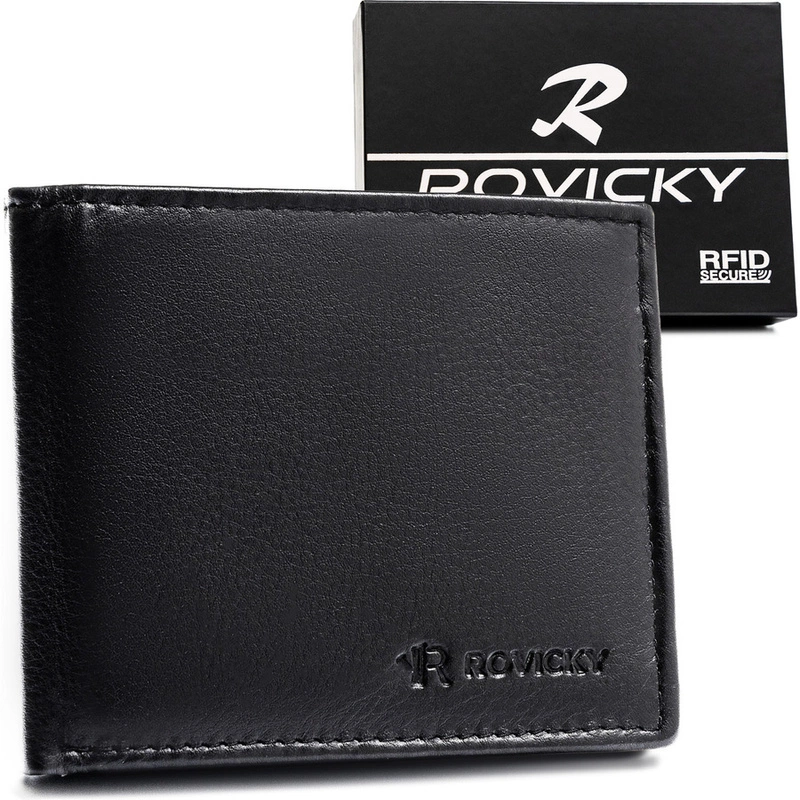 Mały, czarny portfel męski ze skóry naturalnej wyposażony w system RFID - Rovicky