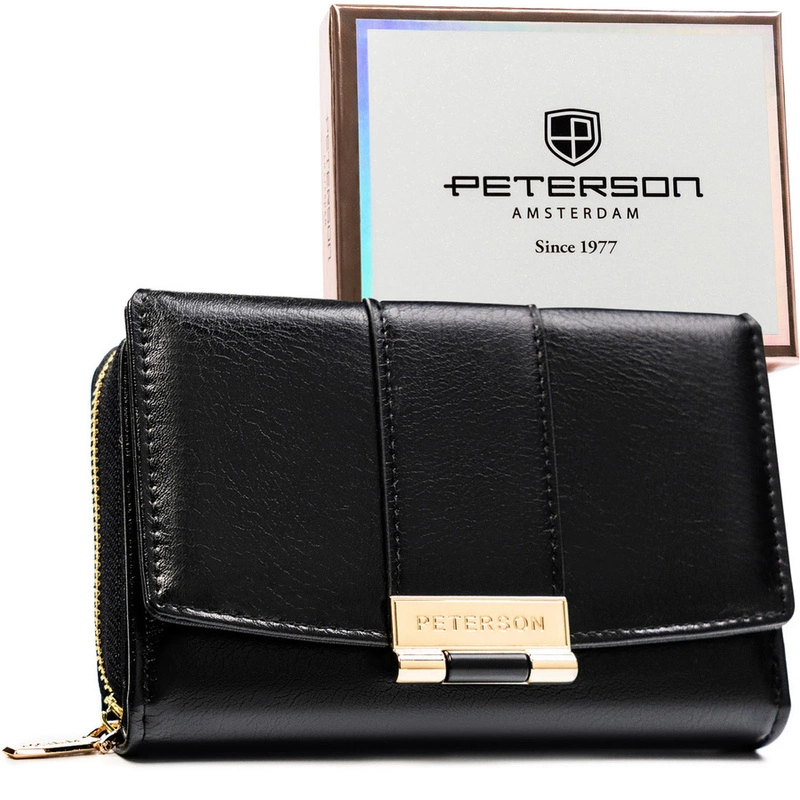 Poziomy portfel damski wykonany ze skóry ekologicznej w czarnym kolorze, zamykany na zatrzask - Peterson