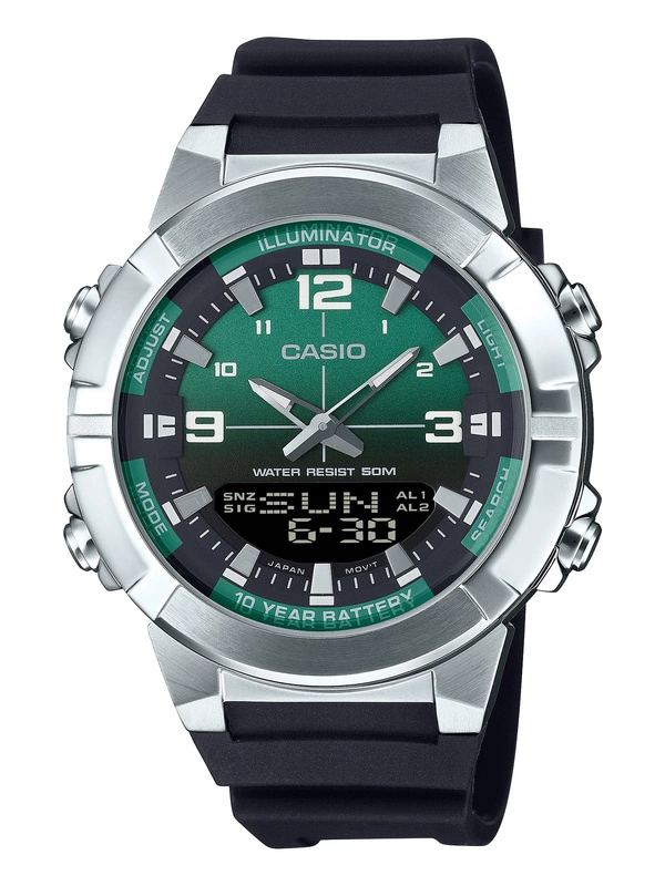 Zegarek męski CASIO AMW-870A-3A to połączenie funkcjonalności i niezawodności w klasycznym stylu. Ten model zachwyca swoją uniwersalnością, idealnie sprawdzając się zarówno w codziennych sytuacjach, jak i podczas bardziej formalnych okazji. Jego okrągła, stalowa koperta w srebrnym odcieniu emanuje ciekawym designem, a jednocześnie zapewnia wytrzymałość na długie lata. Tarcza zegarka, utrzymana w zielonej kolorystyce, została ozdobiona wyraźnymi indeksami oraz wskazówkami pokrytymi luminescencyjną powłoką, co gwarantuje doskonałą czytelność nawet w warunkach słabego oświetlenia.
