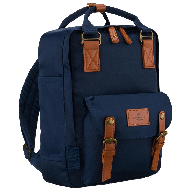 Granatowo-brązowy plecak damski z poliestru i skóry ekologicznej, zamykany suwakiem - Peterson
