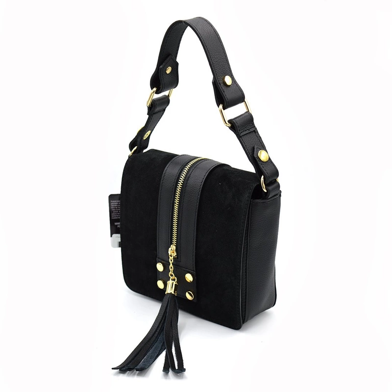 - Torebka z zamszu. Złote okucia nadają jej klasy i szyku. Przód listonoszki zdobi zamek, zakończony frędzlem. Wyposażona w krótki pasek, oraz dodatkowy, długi. Połączenie elegancji i oryginalności. Produkt dla najbardziej wymagających kobiet.