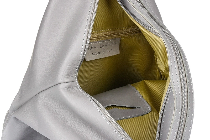 Gustowny i solidny, skórzany, włoski plecaczek w jasno-szarym kolorze.