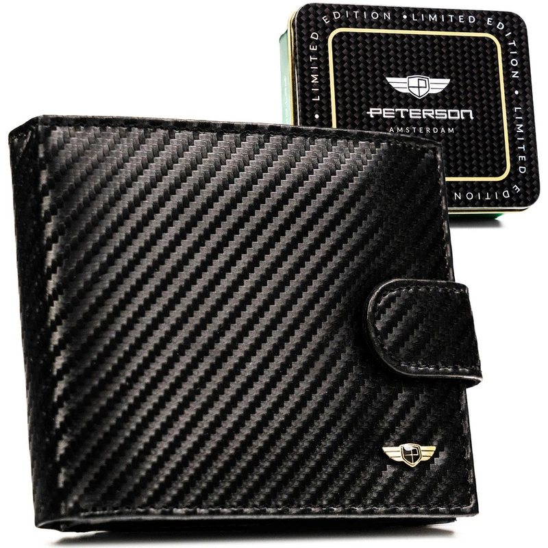 Poziomy portfel męski ze skóry naturalnej w czarnym kolorze wyposażony w system RFID, w zestawie z brelokiem - Peterson