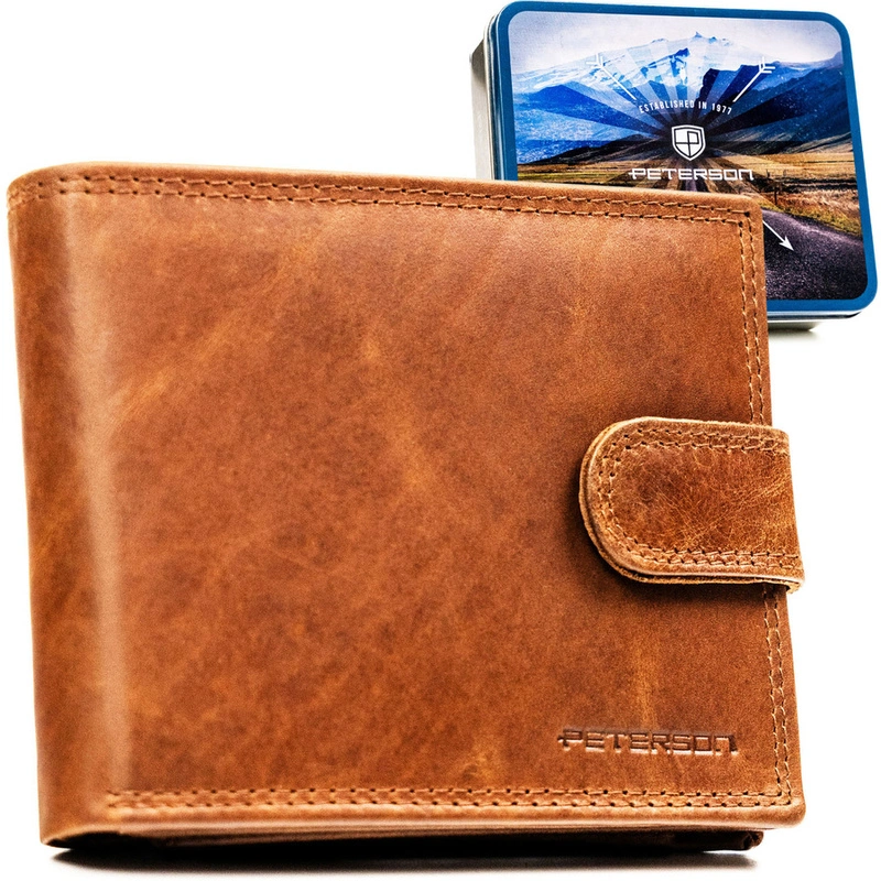 Brązowy, skórzany portfel męski wyposażony w system RFID i zamykany zatrzaskiem - Peterson