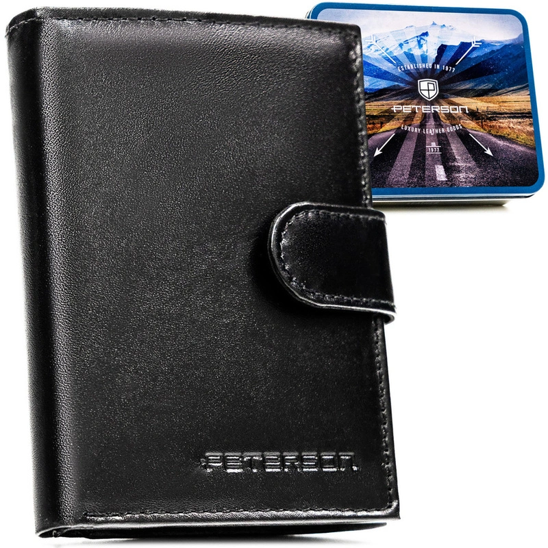 Elegancki portfel męski ze skóry naturalnej w czarnym kolorze zamykany zatrzaskiem, w zestawie z brelokiem - Peterson