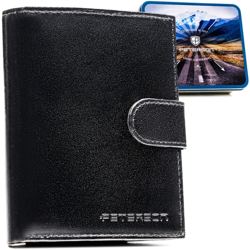 Portfel męski ze skóry naturalnej w czarnym kolorze z systemem RFID i w zestawie z brelokiem - Peterson