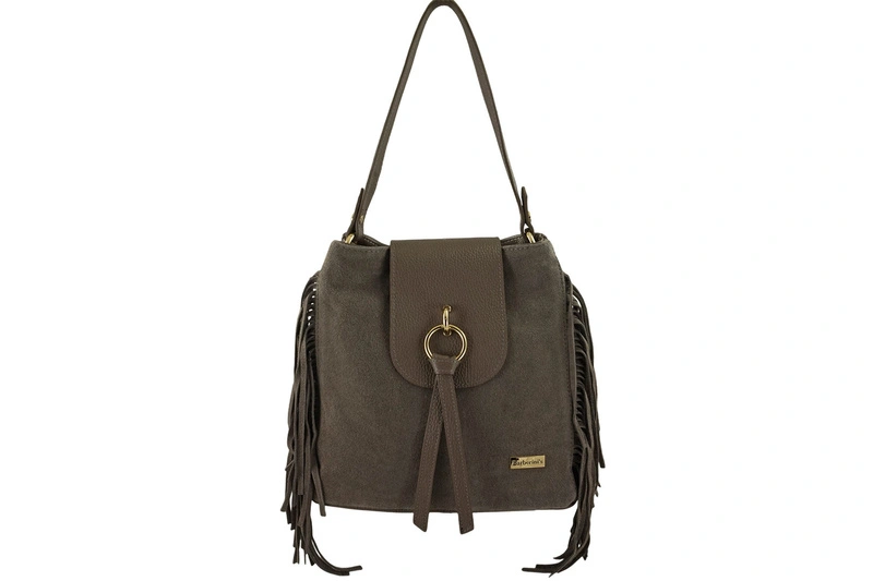 Skórzana torebka boho z frędzlami w kolorze ciemnego beżu. Klasyczna torebka damska o średniej wielkości, która łączy ponadczasową elegancję z subtelnym stylem boho. Wykonana z wysokiej jakości skóry naturalnej – połączenie gładkiej skóry licowej oraz miękkiego zamszu na froncie, idealnie dopasowanego kolorystycznie do całości. Starannie dobrane złote okucia dodają jej szlachetnego charakteru i podkreślają uniwersalny styl. Charakterystycznym elementem torebki są dekoracyjne frędzle po bokach, wykonane z miękkiego zamszu, które nadają całości lekkości i pięknie poruszają się w ruchu, ożywiając klasyczną formę torebki i sprawiając, że model wyróżnia się na tle minimalistycznych dodatków. Skórzana torebka boho z frędzlami świetnie komponuje się z codziennymi stylizacjami, doskonale uzupełni również bardziej eleganckie zestawy.