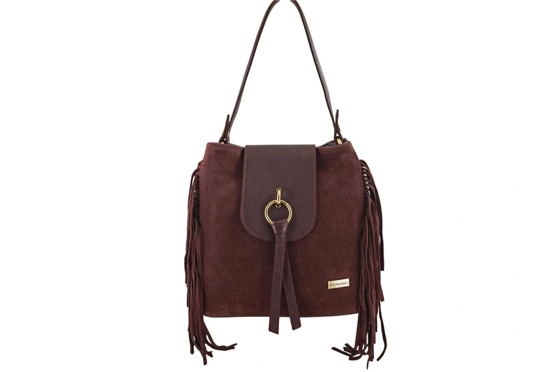 Skórzana torebka boho z frędzlami w kolorze bordowym. Klasyczna torebka damska o średniej wielkości, która łączy ponadczasową elegancję z subtelnym stylem boho. Wykonana z wysokiej jakości skóry naturalnej – połączenie gładkiej skóry licowej oraz miękkiego zamszu na froncie, idealnie dopasowanego kolorystycznie do całości. Starannie dobrane złote okucia dodają jej szlachetnego charakteru i podkreślają uniwersalny styl. Charakterystycznym elementem torebki są dekoracyjne frędzle po bokach, wykonane z miękkiego zamszu, które nadają całości lekkości i pięknie poruszają się w ruchu, ożywiając klasyczną formę torebki i sprawiając, że model wyróżnia się na tle minimalistycznych dodatków. Skórzana torebka boho z frędzlami świetnie komponuje się z codziennymi stylizacjami, doskonale uzupełni również bardziej eleganckie zestawy.