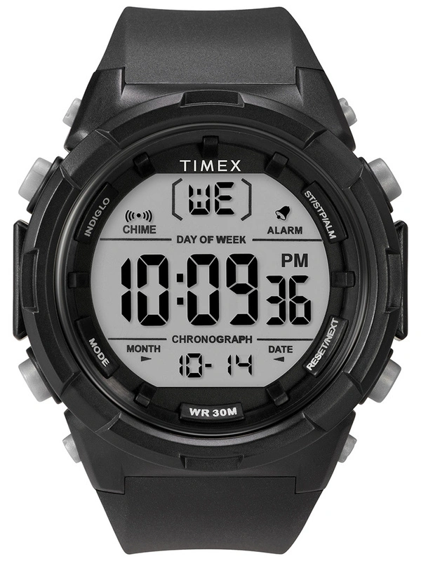 Zegarek męski Timex TW5M61900 to sportowy model z czytelnym, cyfrowym wyświetlaczem, idealny do codziennego użytkowania. Wyposażony jest w precyzyjny mechanizm kwarcowy oraz funkcje takie jak stoper, alarm, timer, datownik i tryb 12/24 h, a podświetlenie INDIGLO® zapewnia doskonałą widoczność w ciemności. Koperta o średnicy 50 mm oraz pasek wykonane z wytrzymałego tworzywa gwarantują lekkość i komfort noszenia. Zegarek posiada szkło akrylowe oraz wodoszczelność do 30 m, co chroni go przed zachlapaniami podczas codziennych aktywności..