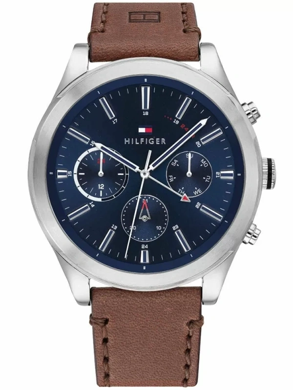 Zegarek męski Tommy Hilfiger Ashton TH1791741 to elegancki czasomierz, który wyróżnia się granatową tarczą z dodatkowymi funkcjami, takimi jak sub-tarcza do pomiaru czasu dobowego, datowniki dni miesiąca i tygodnia. Srebrna koperta z wysokiej jakości stali nierdzewnej została zestawiona z klasycznym brązowym skórzanym paskiem. Zegarek napędza precyzyjny mechanizm kwarcowy, zapewniający niezawodność w codziennym użytkowaniu.