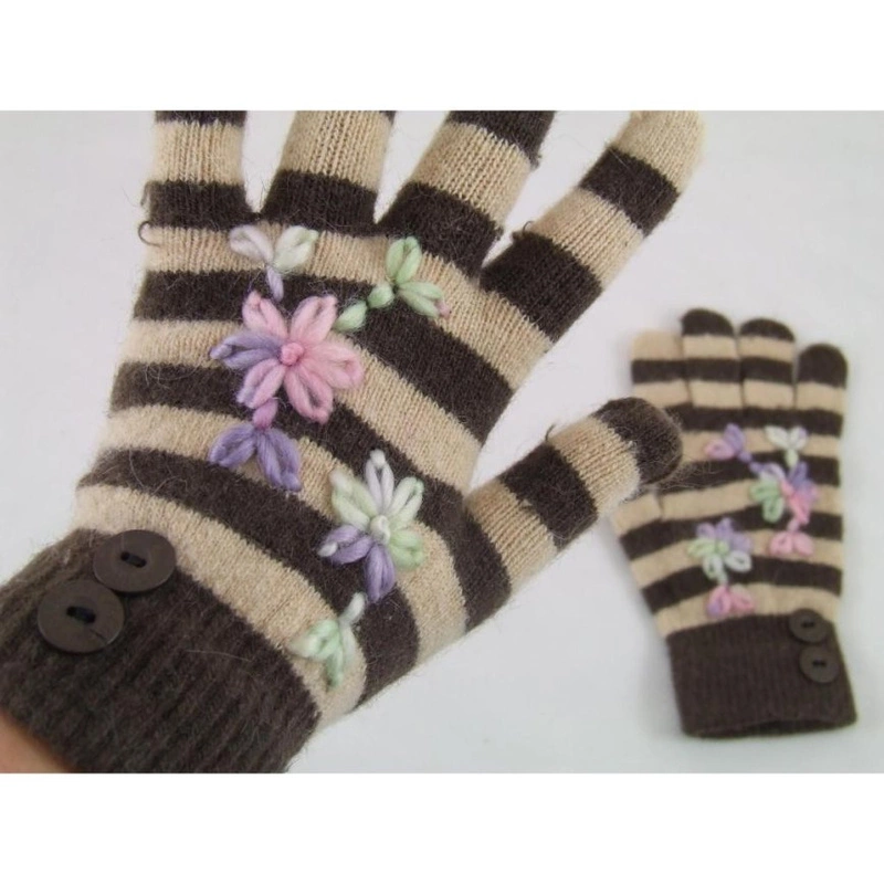 Pasiaste rękawiczki zdobione kwiecistym haftem i guziczkami.