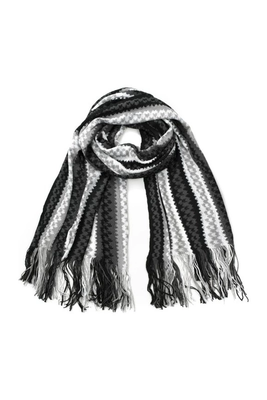 Przejściowy szalik ozdobiony motywem zygzaków. Wykończony długimi frędzlami.