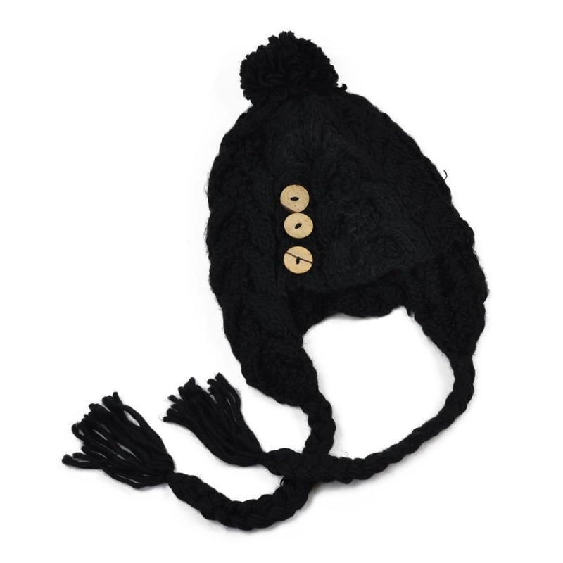 Czapka z pomponem, ozdobiona trzema guzikami.