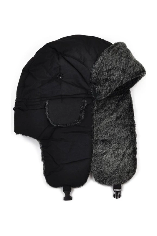Ma dodatkową klapkę na ucho również podszytą futerkiem, którą można przypiąć do góry lub do dołu.