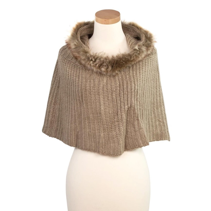 Dzianinowa zimowa pelerynka z kapturem wykończonym futerkiem.