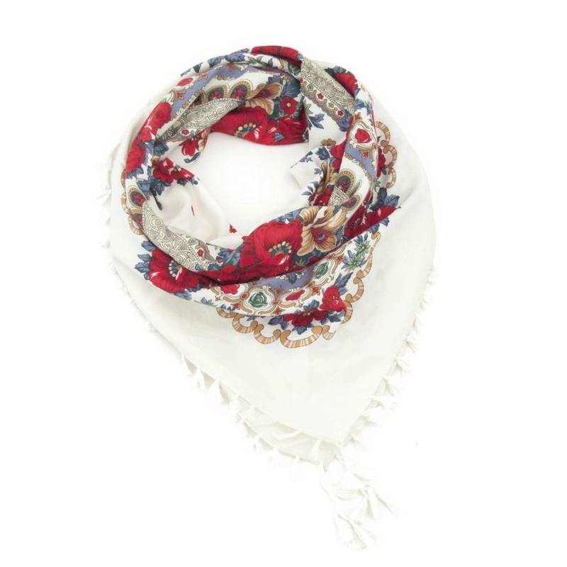 Folkowa chusta w wyraziste kwieciste wzory, zakończona frędzelkami.