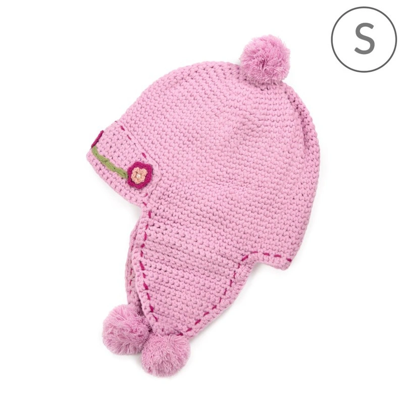 Czapka dla dziecka chroniąca uszy ozdobiona kwiatowym motywem.