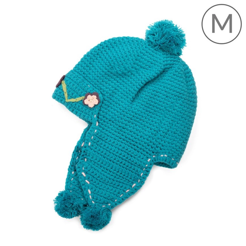Czapka dla dziecka chroniąca uszy ozdobiona kwiatowym motywem.