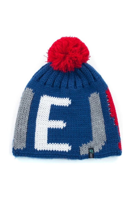 Ciepła, podwójna czapka z napisem HEJ! i pomponem.