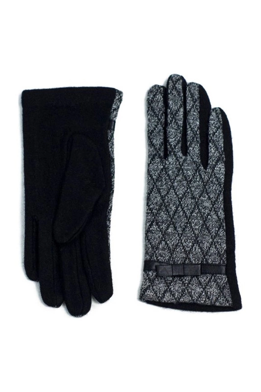 Wełniane rękawiczki damskie w kratkę w romby. Zdobione kokardką.