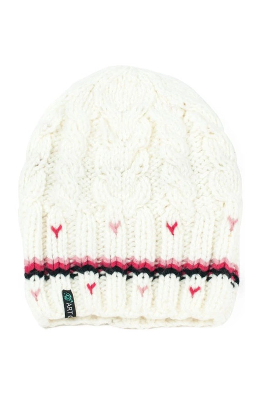 Śliczna zimowa czapka typu beanie ozdobiona kolorowymi paskami.