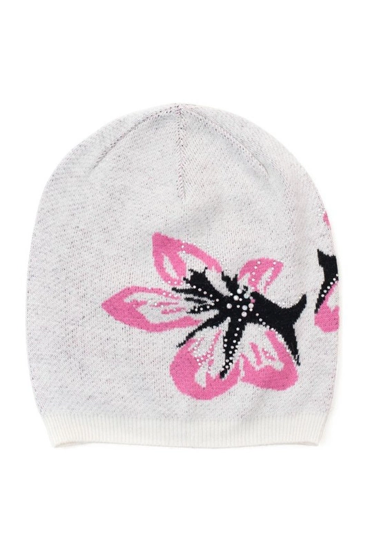 Elegancka czapka typu beanie z motywem rajskiego kwiatu ozdobionego błyskotkami.