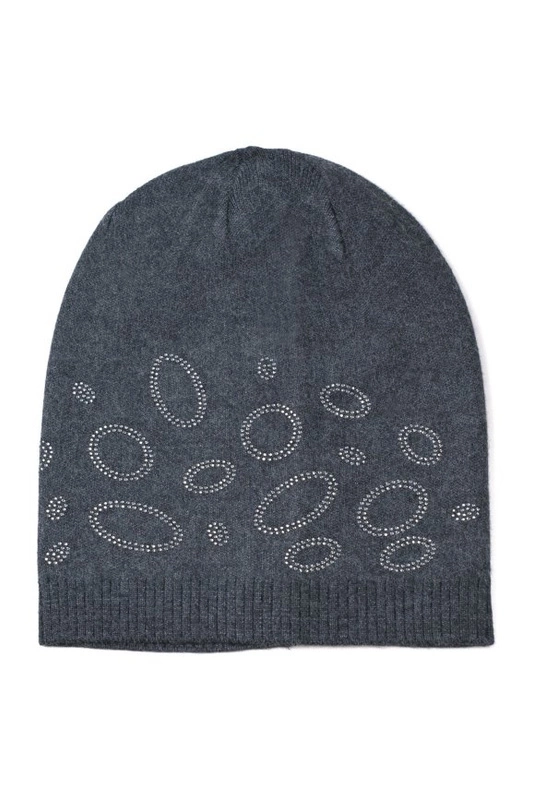 Elegancka czapka damska ze ściągaczem, ozdobiona błyszczącymi kółkami.
