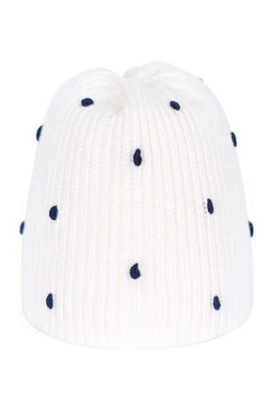 Dziecięca czapka ozdobiona wyszywanymi groszkami.