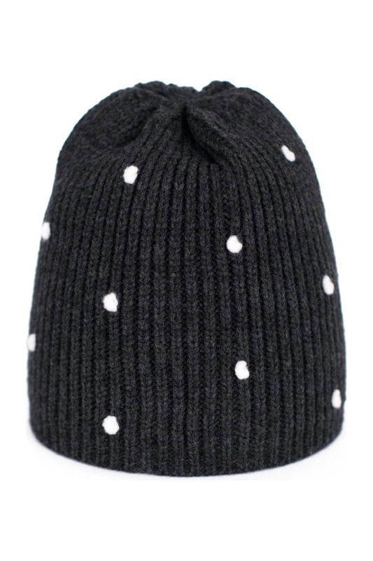 Dziecięca czapka ozdobiona wyszywanymi groszkami.
