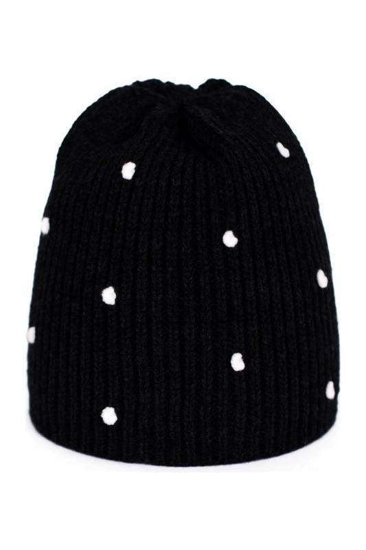 Dziecięca czapka ozdobiona wyszywanymi groszkami.