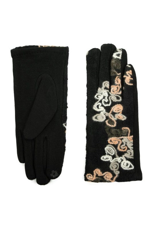 Eleganckie, kolorowe rękawiczki z ozdobnym, kolorowym motywem.
