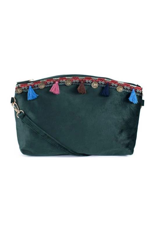 Stylowa torebka ozdobiona haftowaną taśmą, frędzelkami i monetkami.
