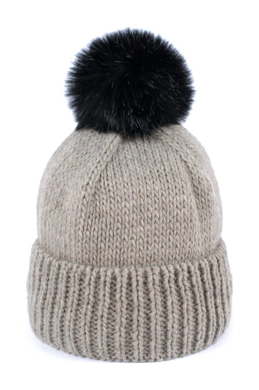 Czapka z podwinięciem i pomponem ze sztucznego futerka.